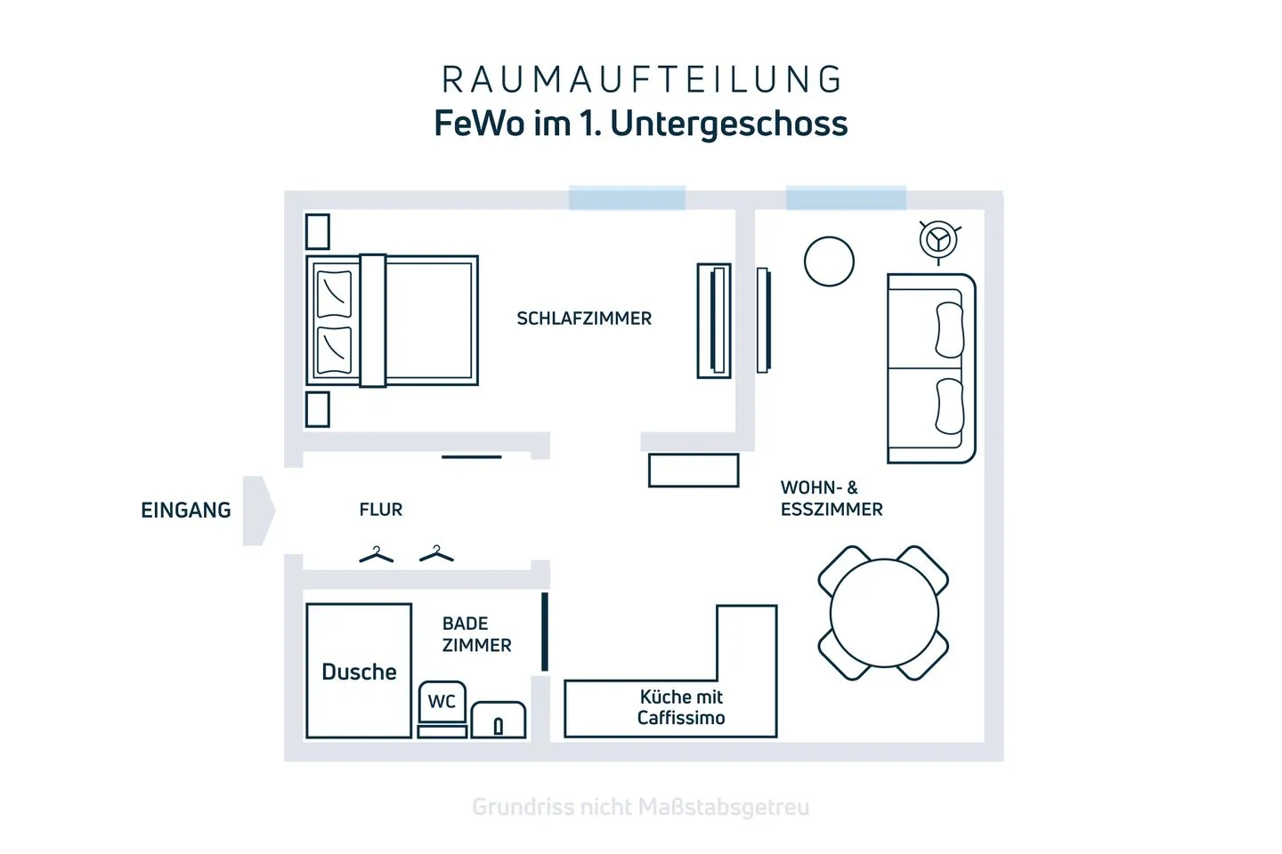 KÜCHE & WOHNBEREICH: Die offene Küche ist perfekt für gemeinsame Kochabende geeignet und bestens ausgestattet. Große Fenster sorgen für viel natürliches Licht und eine helle, freundliche Atmosphäre – trotz der Lage im Untergeschoss. Es kann zudem niemand in die Ferienwohnung hineinschauen. Im Wohnzimmer steht ein großer 50" Smart-TV bereit, im Schlafzimmer ein weiterer 42" Smart-TV – ideal für entspannte gemütliche Filmabende.